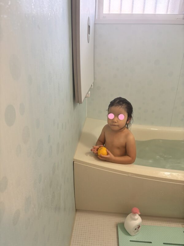 柚子を入れると浴室に柚子の香りが広がり、子どもたちは、「わぁ みかん」と言って、柚子を触れ合ったり香りを楽しんで温まることができました。